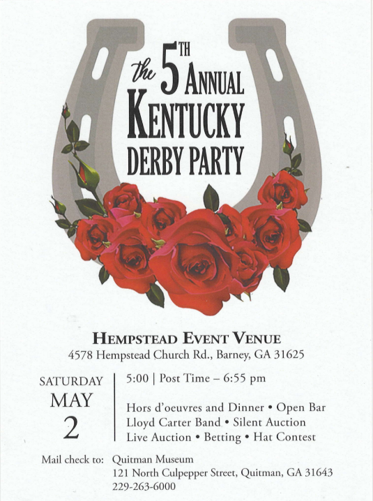 The museum sponsored a very successful Kentucky Derby Party fundraiser on May 6, 2023. With approximately 300 in attendance we had a grand time with a buffet of delicious food, as well as, music and dancing. There were many items auctioned through our Live and Silent Auctions and eleven winners shared in the race winnings. The ladies wore fancy hats with winners chosen in two categories. It was a beautiful evening as the sun set on the fun and fellowship under the big tent beautifully decorated with roses. My what a great time was had by all.
